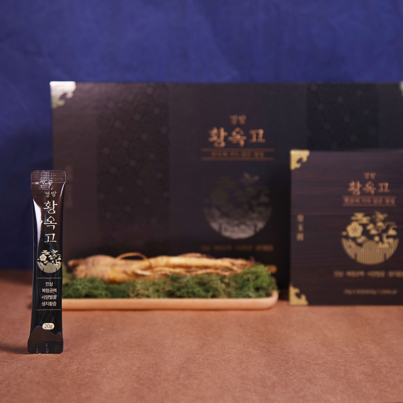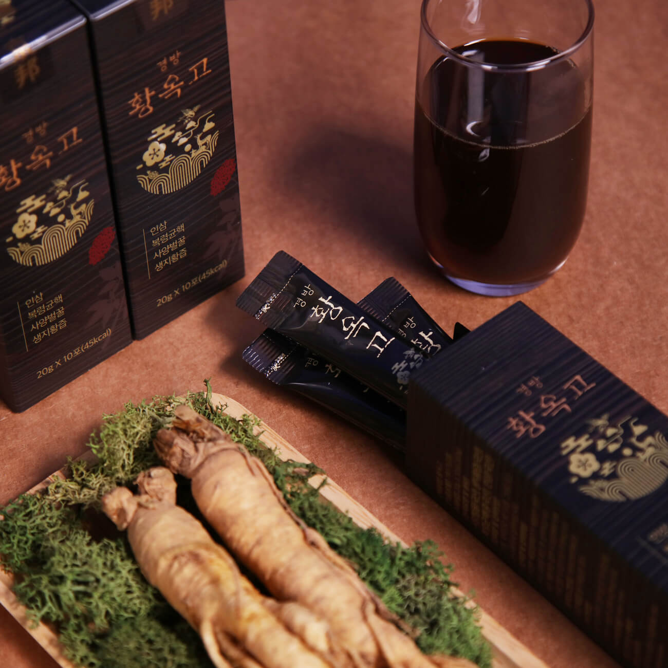 Hwangok-go, made from 6-year-old Korean ginseng, is made with precious traditional ingredients like honey, poria mushroom, and fresh foxglove extract. Each pack is filled with dedication.